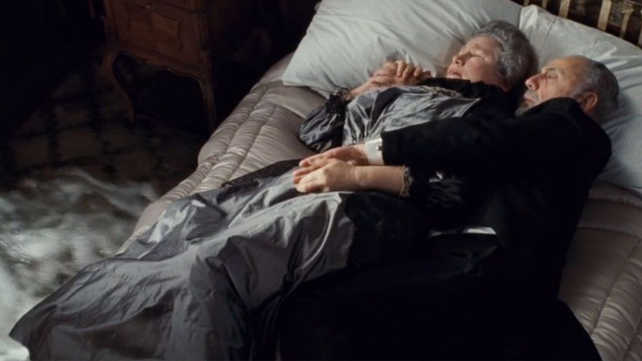 En la cinta de Cameron, una pareja de ancianos reposa en su cama, abrazados, mientras el agua se va filtrando por su camarote y afuera unos 2 mil 223 pasajeros buscan sobrevivir.