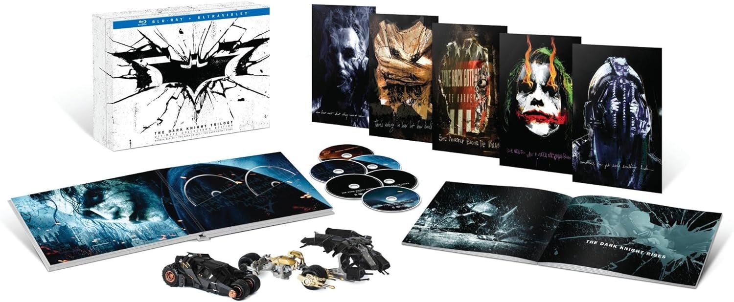 Contiene las tres películas en Blu-ray así como un libro de arte con imágenes de la producción, litografías de los diferentes villanos de las películas recreadas con ilustraciones artísticas y más de 90 minutos de material extra que retoman entrevistas detrás de las cintas. Pero la joya de la corona son tres figuras a escala de los tres tipos de vehículos que Batman usa en estas películas. Ya para cerrar con broche de hora, la segunda y tercera entrega incluyen las secuencias completas filmadas en IMAX.