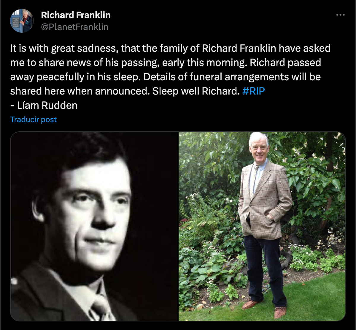 La noticia fue compartida por Liam Rudden, un amigo cercano a la familia de Richard Franklin. “Con gran tristeza, la familia de Richard Franklin me ha pedido que comparta la noticia de su fallecimiento esta mañana temprano".