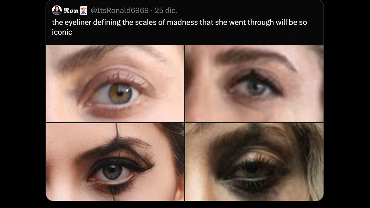 "El delineador de ojos que define las escalas de locura por las que pasó será tan icónico", es la frase que acompaña un par de imágenes de Lady Gaga en el personaje de Harley Quinn, quien poco a poco cambia su maquillaje conforme supuestamente avanzará la película junto a Joaquin Phoenix. A la publicación, otro usuario le respondió diciendo: "Teresa lo hizo primero", mostrando como la sombra y el delineado del icónico personaje se fue haciendo cada vez más intenso. ¿Habrá alguna otra similitud entre Teresa y Harley Quinn?