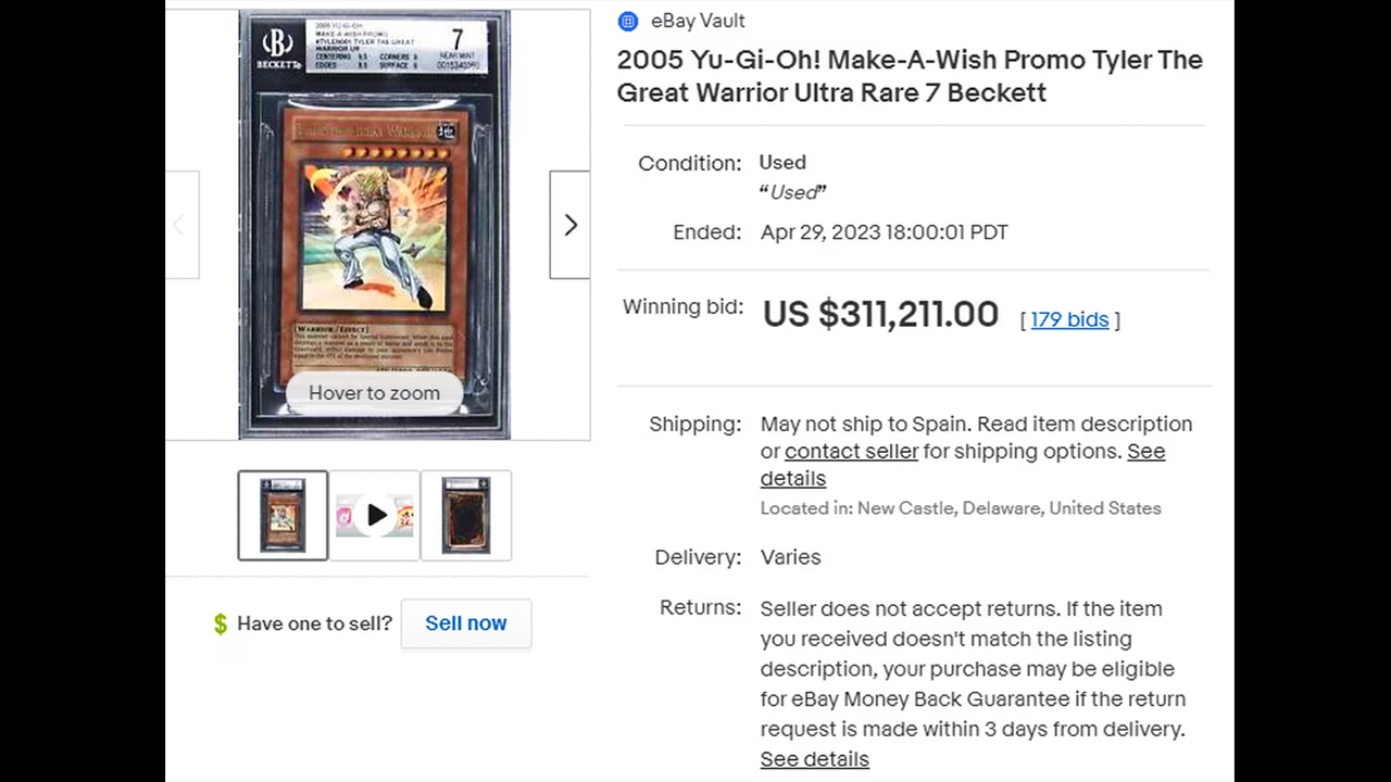 Se trata de "Tyler the Great Warrior", que con sólo mirarla, cualquier fanático de Dragon Ball podría darse cuenta de que se trata de un homenaje a Trunks del futuro. La venta de la carta ocurrió en eBay, donde un fanático desembolsó un par de millones de pesos para obtener este raro objeto y agregarla a su colección. Hasta el momento, la carta inspirada en Dragon Ball es la más cara en toda la historia del anime del Duelo de Monstruos.