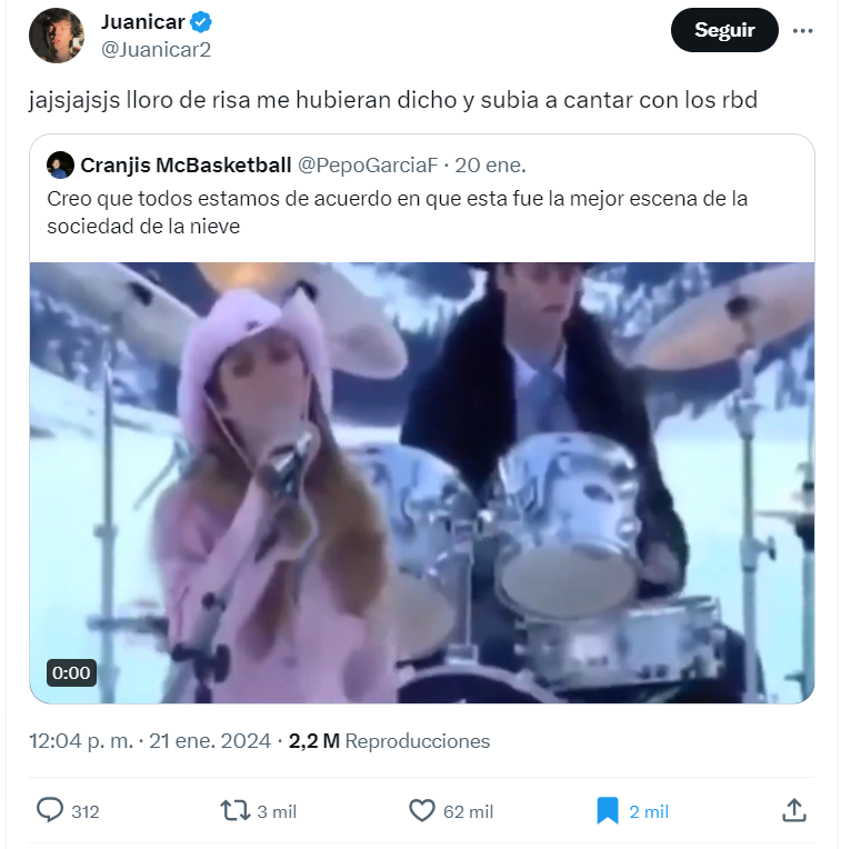 Este crossover no pasó desapercibido por Juan Caruso (@juanicar2), quien interpretó a Álvaro Mangino y constantemente se la pasa publicando en X sobre la película. “Lloro de risa me hubieran dicho y subía a cantar con los de RBD”, escribió el actor chileno, mientras que otros espectadores comentaron “El verdadero y real sobrevivo por pura ansiedad, vivo en la desesperanza”. ¿Te imaginas a Mia Colucci llorando en la nieve sola y desamparada?