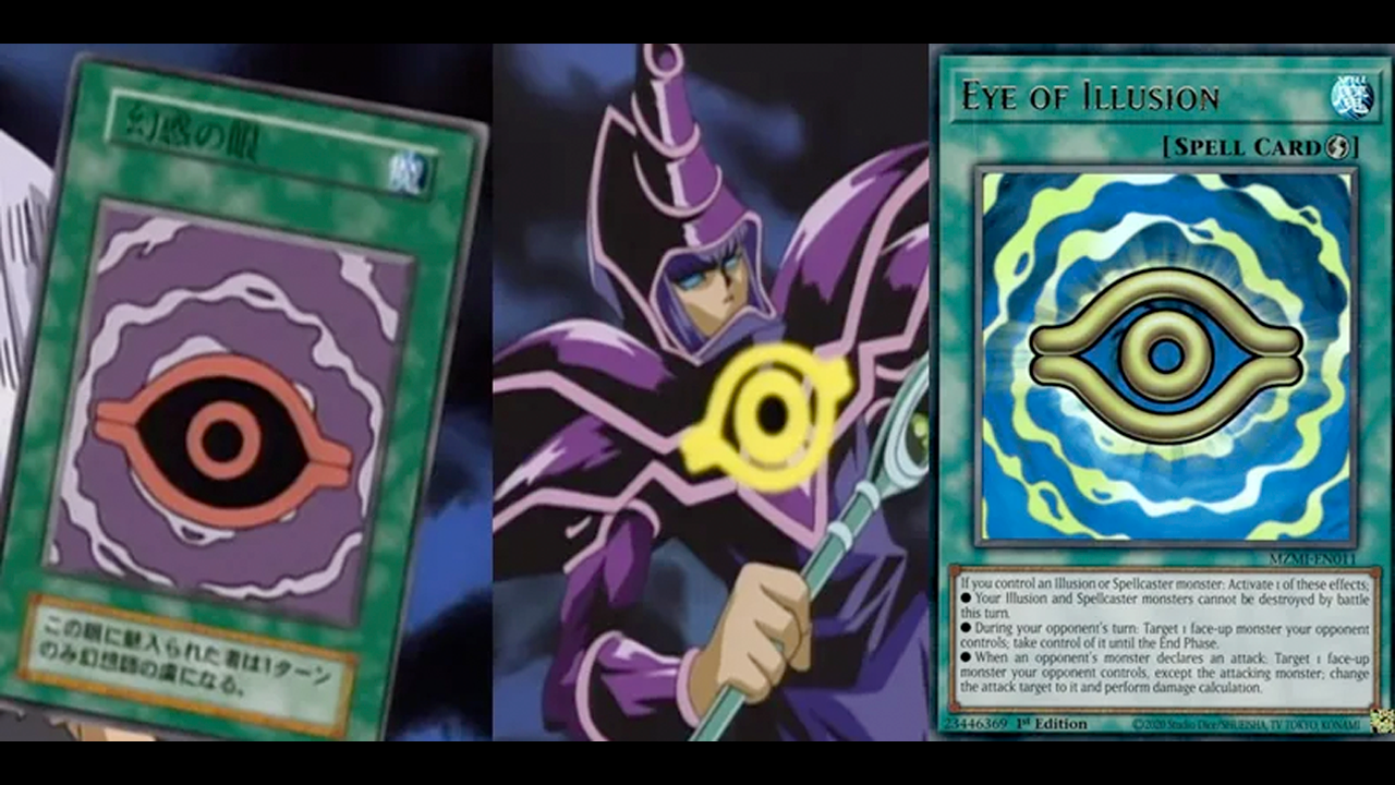 La esperada carta es "El ojo de la ilusión", que debutó en el segundo episodio de Yu-Gi-Oh al ser utilizada por el villano de Maximillion Pegasus. En el capítulo, Pegasus hace que Yugi sea absorbido por la televisión mientras roba el alma de su abuelo, para luego jugar la carta de "El ojo de la ilusión" y tomar el control del Mago Oscuro, que forma parte del mazo de Yugi. En el mismo capítulo, Pegasus le dice a Yugi sobre la existencia de los Artículos Milenarios, siendo el Rompecabezas que lleva en el cuello es uno de ellos.