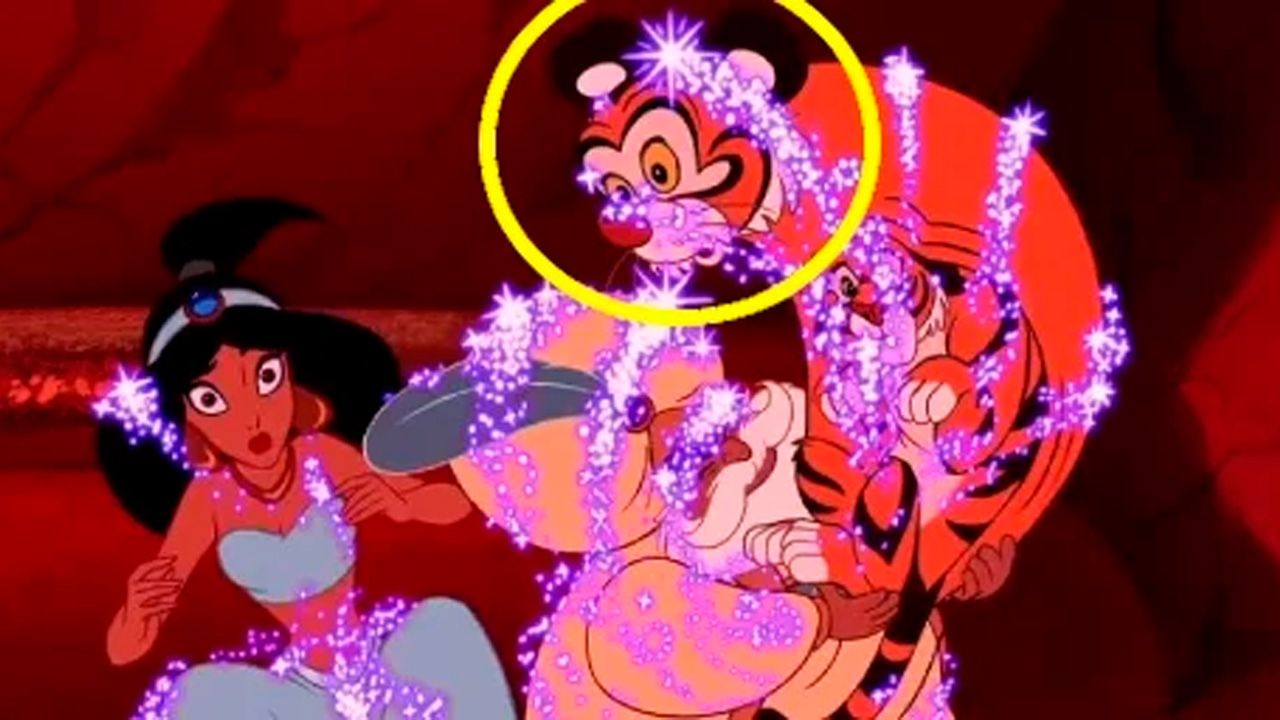 ¿Mickey Mouse tiene un papel en Aladdín? No precisamente, pero sí podemos ver su cara por un milisegundo. Cuando el tigre Rajah, quien se había convertido en un gatito, comienza a recuperar su forma original podemos ver que mientras se hace grande las facciones de su rostro adaptan las características del ratón del estudio. Las orejas, ojos y nariz son las mismas que las de Mickey Mouse, sólo que sucede tan rápido que es casi imposible notarlo.
