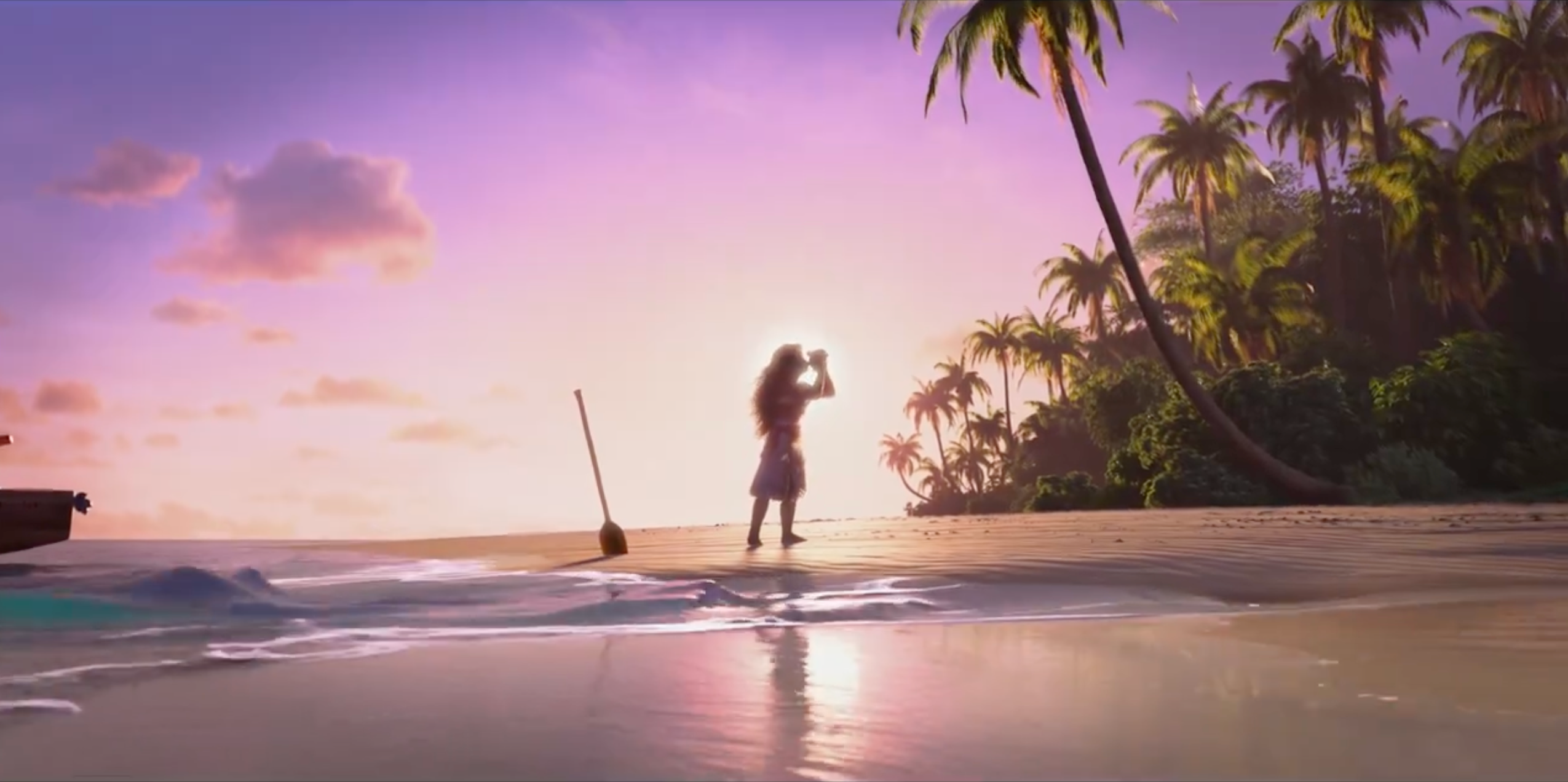 En el segundo caso se trata de un teaser de 17 segundos que inicia con un cálido atardecer en una pequeña isla. Esto cambia rápidamente para mostrarnos a Moana de pie en la orilla de la playa y tocando un caracol de mar.