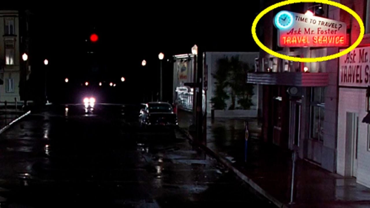 A bordo del DeLorean, Marty se encamina a la pista antes de que caiga el rayo en el Ayuntamiento y le dé la energía necesaria para arrancar y dar un salto en el tiempo. Si prestas atención y pausas la película cuando el cronómetro esté en 1 hora, 40 minutos y 7 segundos, notarás que hay una tienda sobre la avenida principal del poblado en la que se posa un letrero neón con la leyenda “¿Es hora de viajar? Pregúntale al Sr. Foster. Servicios de viaje”.