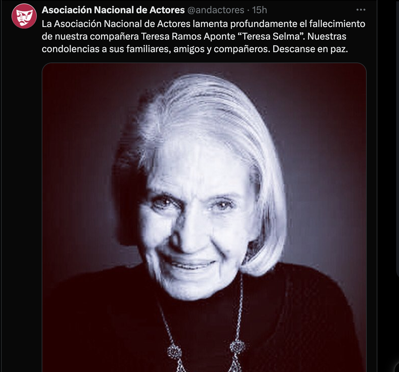 La noticia fue confirmada por La Asociación Nacional de Actores (ANDA) a través de un mensaje en redes sociales. “La Asociación Nacional de Actores lamenta profundamente el fallecimiento de nuestra compañera Teresa Ramos Aponte ‘Teresa Selma’. Nuestras condolencias a sus familiares, amigos y compañeros. Descanse en paz”.