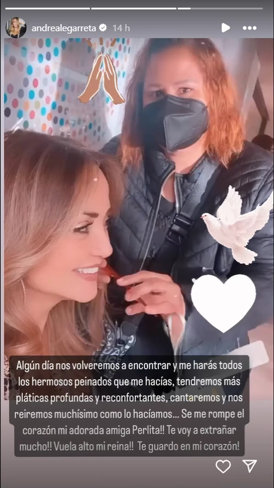 A través de redes sociales, Andrea Legarreta compartió un mensaje que apuntaba a una trágica pérdida. “Algún día nos volveremos a encontrar y me harás todos los hermosos peinados que me hacías; tendremos más pláticas profundas y reconfortantes, cantaremos y nos reiremos muchísimo como lo hacíamos... Se me rompe el corazón, mi adorada amiga Perlita!! Te voy a extrañar mucho!! Vuela alto mi reina!! Te guardo en mi corazón”, mencionó.