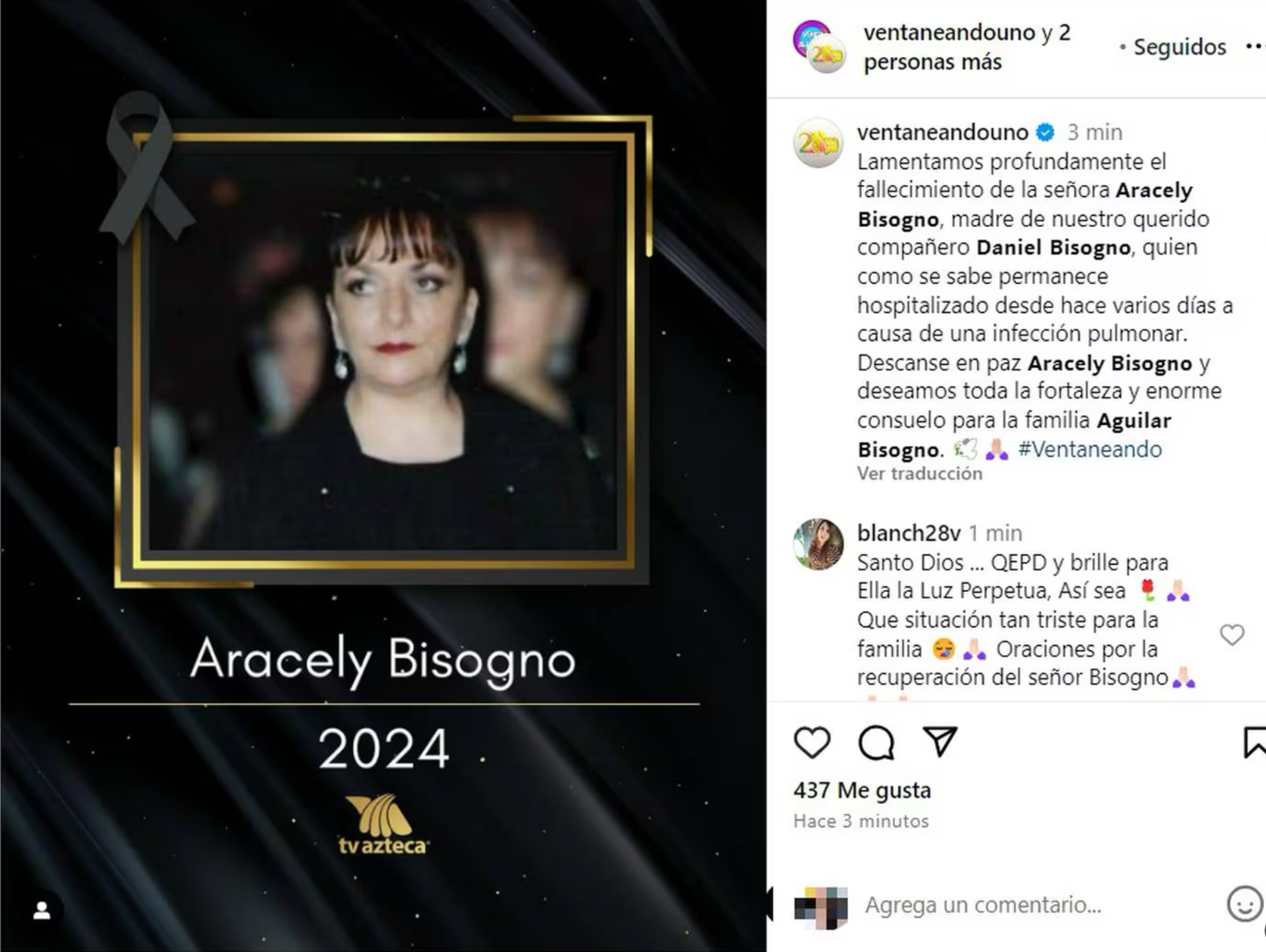 A través de redes sociales del programa de televisión se confirmó el deceso de María Araceli Bisogno Tapia. “Lamentamos profundamente el fallecimiento de la señora Aracely Bisogno, madre de nuestro querido compañero Daniel Bisogno, quien como se sabe permanece hospitalizado desde hace varios días a causa de una infección pulmonar. Descanse en paz Aracely Bisogno y deseamos toda la fortaleza y enorme consuelo para la familia Aracely Bisogno”.