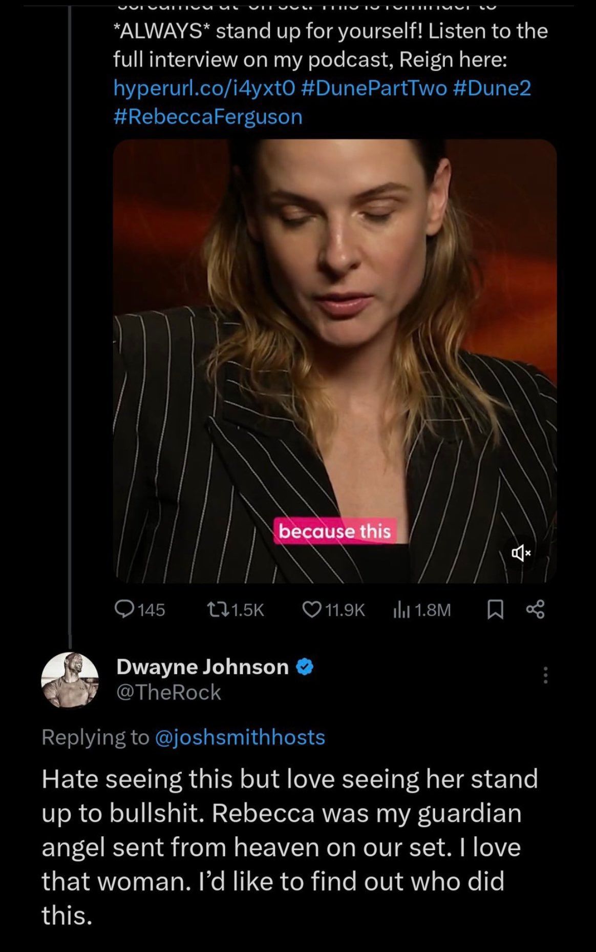 “Odio enterarme de esto, pero amo verla alzar la voz ante estas tonterías. Rebecca fue mi ángel de la guarda que nos enviaron del cielo a nuestro set. Aprecio a esa mujer. Me gustaría saber quién hizo esto”, publicó el actor de Black Adam en X. Los fans no están seguros de si su comentario fue para quitarse la culpa o si fue genuino. Mientras tanto, el chismecito continúa en redes sociales, pero no sabemos si algún día saldrá la verdad a la luz. Recuerda que Dune 2 estrena este jueves 29 de febrero en salas de México.