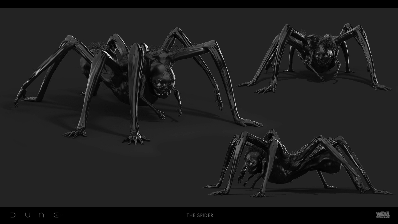 El arte conceptual compartido por el estudio de efectos especiales Wētā Workshop en ArtStation revela dos diseños alternativos para la espeluznante araña. Uno presenta un rostro humano calvo que se parece notablemente a uno de los lacayos del barón Harkonnen. El otro tiene un rostro menos humanoide, más insectoide, con ojos saltones y brazos diminutos. Ambos son suficientemente para provocar pesadillas.