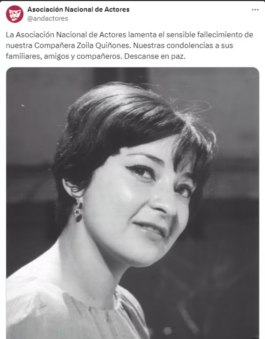 A través de un mensaje en redes sociales se confirmó la muerte de Zoila Quiñones. “La Asociación Nacional de Actores lamenta el sensible fallecimiento de nuestra Compañera Zoila Quiñones. Nuestras condolencias a sus familiares, amigos y compañeros. Descanse en paz”, reveló la ANDA.