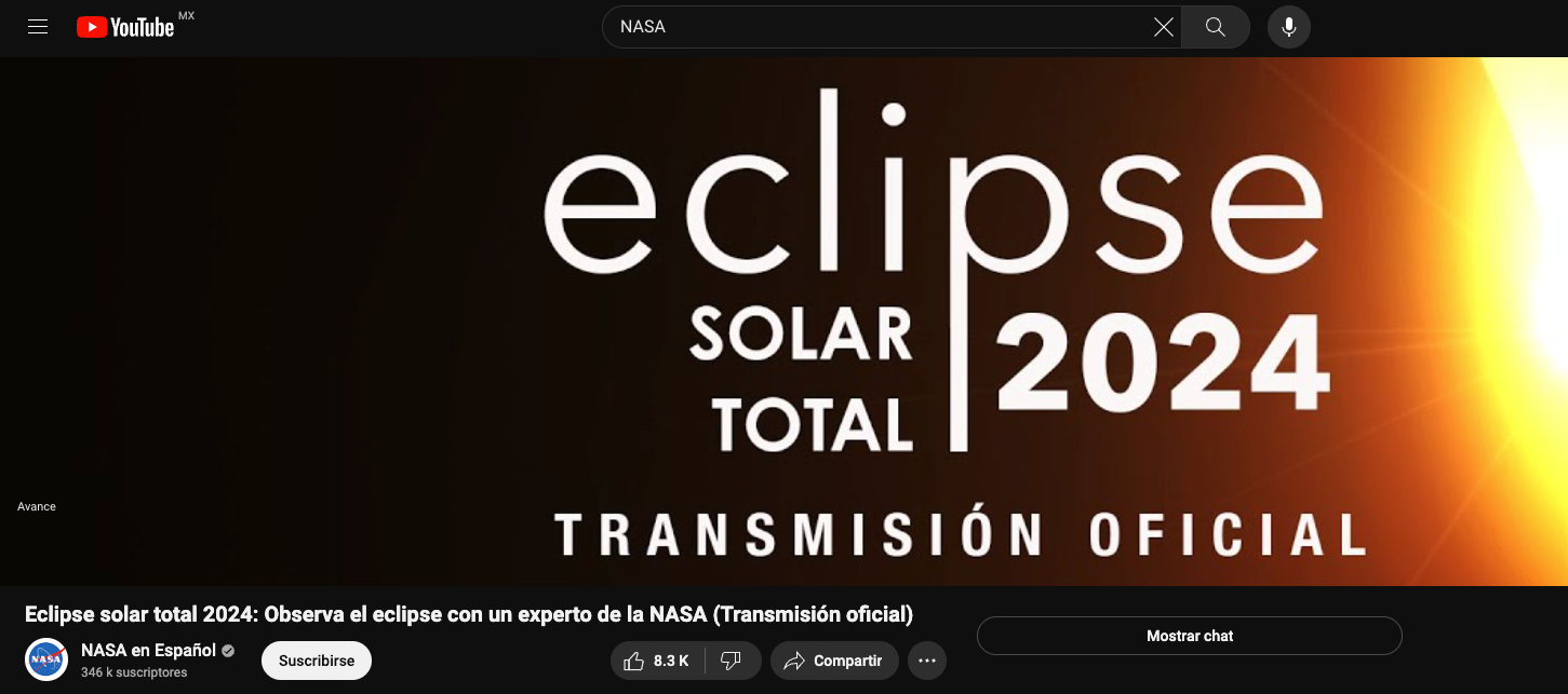 Se trata del canal de la NASA en YouTube, donde podrás encontrar una transmisión en vivo del eclipse solar. Lo mejor de todo es que también existe el canal en español, donde un experto de la agencia espacial estará respondiendo toda clase de preguntas.