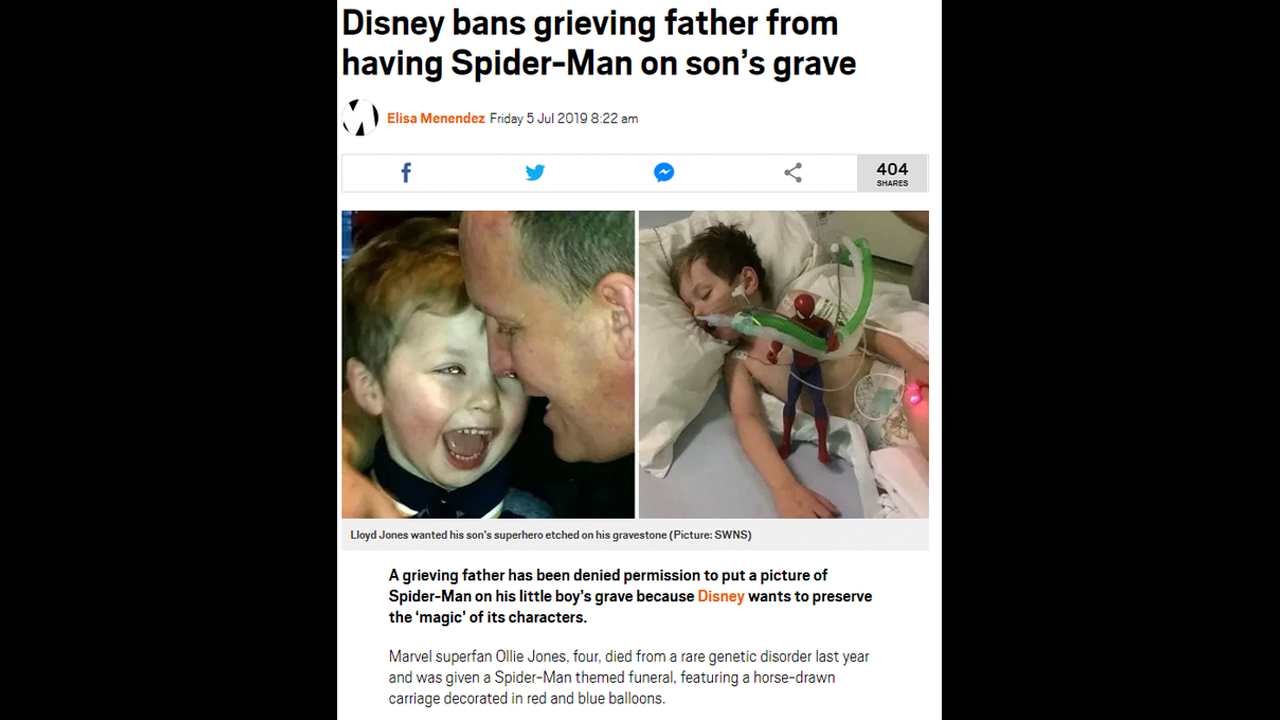 El caso cuenta sobre el pequeño Ollie Jones, un ávido fanático de Marvel que a la edad de cuatro años desarrolló una rara enfermedad genética. Su funeral fue una celebración temática de Spider-Man, con una carruaje con globos y los colores típicos del personaje. Su padre, Lloyd Jones, quiso inmortalizar la memoria de Ollie con un grabado de Spider-Man en su lápida, pero sus esfuerzos se vieron frustrados por la negativa de Disney.