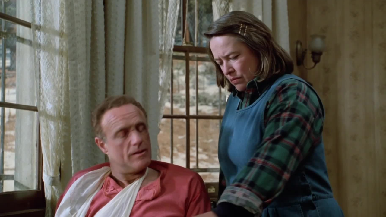 La transformación de Annie de una dulzura repugnante a un grito de rabia se resume perfectamente en la actuación de Bates. Inicialmente parece una dama amable y humilde, con atractivos ojos azules y ropa de maestra de escuela. Un pequeño santuario dedicado a las obras completas de Paul no da pistas obvias de su inestabilidad. Pero cuando tiene un colapso total por la muerte de Misery, el espectador queda atónito.