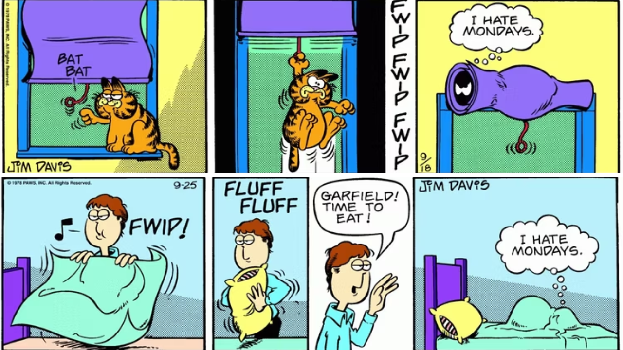 El 18 de septiembre de 1978 (que, sí, era lunes), vemos a Garfield quedar atrapado y enrollado en la pantalla de la ventana antes de explicar cuánto odia los lunes. Curiosamente, mientras que el 18 de septiembre fue la primera vez que Garfield notó cuánto odiaba los lunes, la segunda vez fue el lunes siguiente: 25 de septiembre.
