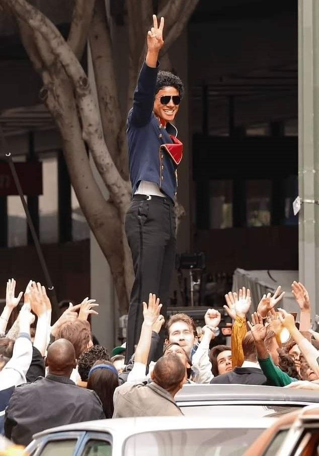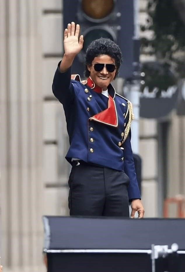 El día de hoy, hemos tenido un nuevo vistazo a la película, traído directamente desde el set de filmación. En las fotografías, podemos ver a Jaafar afuera del AT&T Center de Los Ángeles, vistiendo una elegante chaqueta militar azul marino, con detalles dorados. Asimismo, el actor porta un par de gafas de sol de aviador, pantalones cortos negros con rayas a los lados y calcetines altos color blanco, además de mocasines negros. Jaafar, personificando a Michael Jackson, se puede apreciar en el toldo de un auto, saludando a una multitud emocionada por verlo.