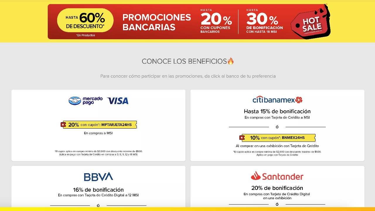 Citibanamex: Obtén 10% de bonificación en compras acumuladas de 10000 pesos mexicanos o hasta 15% si cuentas con nómina en el banco. Además, de un máximo de 5000 pesos de bonificación por usuario y solo es necesario registrarte. Asimismo, un 15% de descuento al utilizar el cupón BNMEX24HS en compra mínima de 2,000 pesos en una sola exhibición con tarjeta de crédito Citibanamex, con un máximo de 500 pesos. Consulta términos y condiciones.