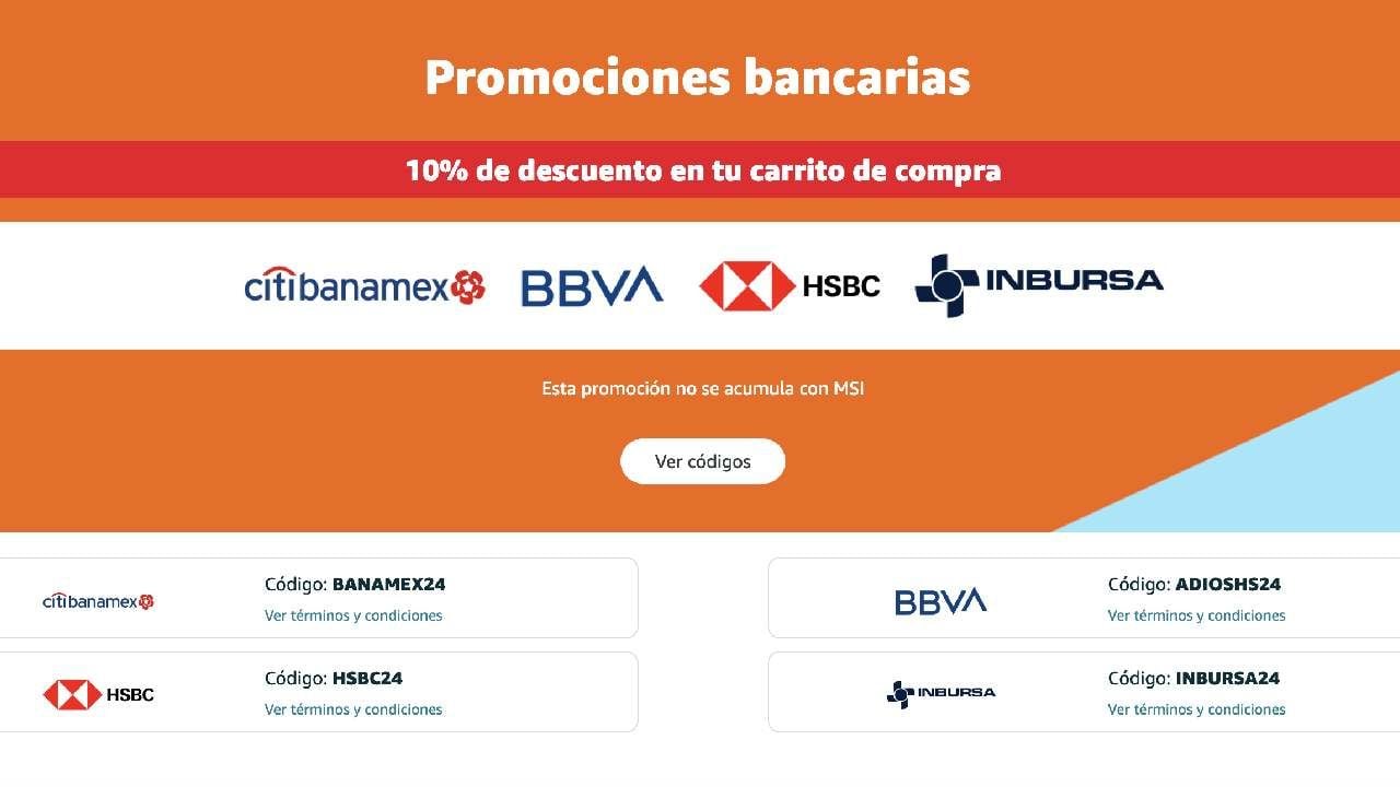 Estos códigos promocionales tiene un 10% de descuento adicional a compras y bancos participantes, los cuales son Citibanamex, HSBC, BBVA e Inbursa con los que agregando 2000 pesos o más en compras en productos vendidos y enviados por Amazon México con pago de contado, se hará un descuento del 10% de manera inmediata.