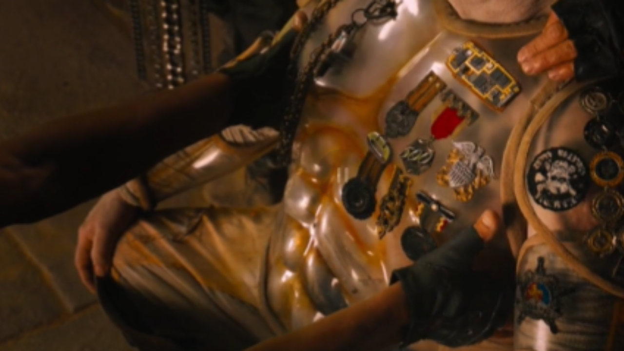 La representación de la vulnerabilidad es ilustrada en la presentación de Immortan Joe (Hugh Keays-Byrne), un personaje que se construye una fachada de inmunidad hipermasculina a partir de su indumentaria. Niños soplan polvo blanco sobre su piel enferma y herida, colocan una armadura rígida sobre su pecho y hombros, mostrando insignias de batalla que lo revalidan como líder y, finalmente, colocan el símbolo del imperio sobre su pelvis, subrayando el carácter patriarcal de su autoridad.