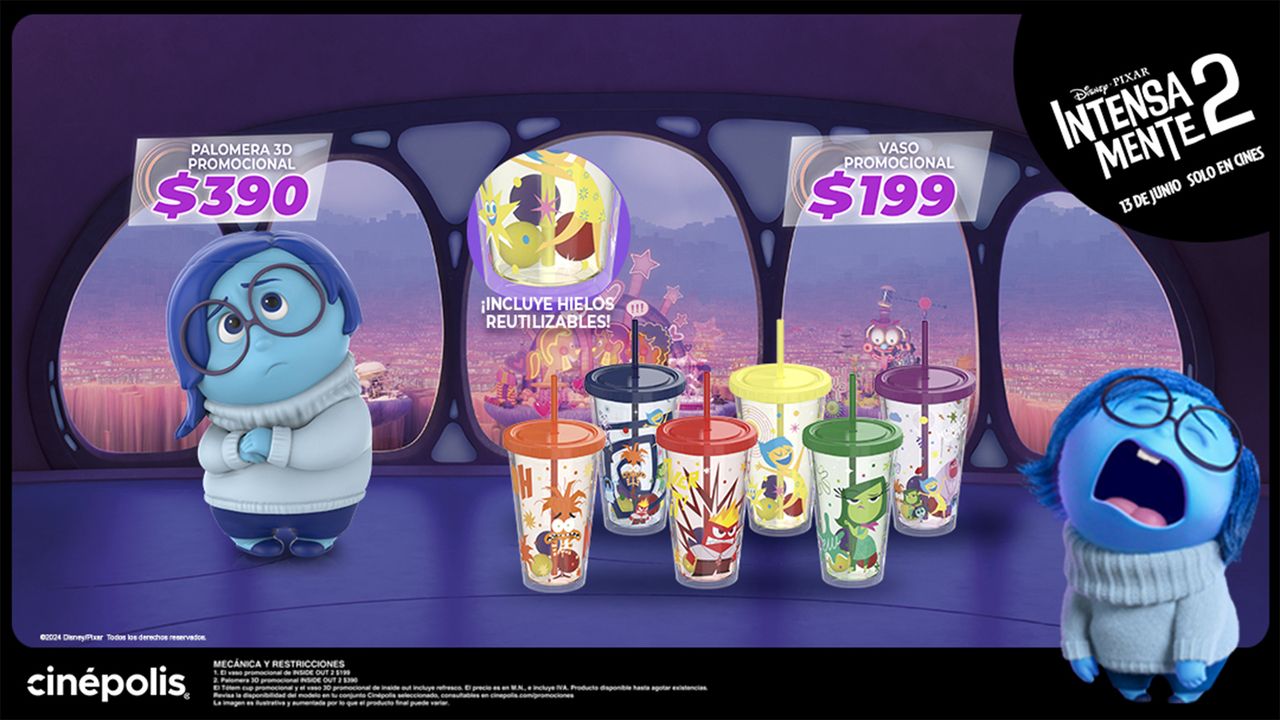 Con motivo del esperadísimo lanzamiento de la nueva película de Disney-Pixar, y como era de esperarse, Cinépolis y Cinemex tendrán a la venta vasos y palomeras coleccionables con la temática de Intensamente 2.