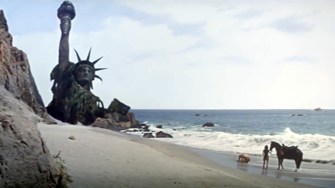 Hacia el final de la película, George está cabalgando por la playa con un compañero cuando se encuentran con la Estatua de la Libertad medio enterrada en la arena. Era la Tierra todo el tiempo. “Oh, Dios mío”, exclama el capitán. “Finalmente lo hicieron. Lo destruyeron todo. ¡Malditos, malditos sean todos!”.