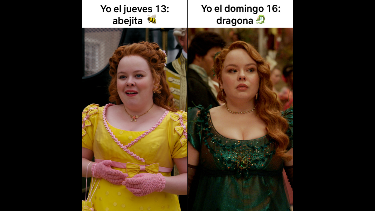 En una imagen compartida a través de la cuenta oficial de Netflix, aparece la dulce Penélope Featherington plasmando las dos personalidades que el público adoptará este fin de semana con las famosas dos series. "Yo el jueves 13: abejita" y "Yo el domingo 16: dragona" dicen las fotografías haciendo alusión a la llegada de la segunda parte Bridgerton, seguido del estreno de House of Dragon.