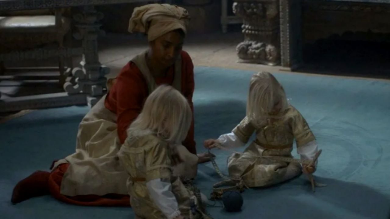 Otra diferencia con respecto a la novela es que los asesinos no van al cuarto de los jóvenes príncipes, sino que entran al de su abuela, Alicent Hightower (Olivia Cooke), en donde la subyugan esperando a los niños quienes diariamente iban con ella para darle un beso de buenas noches. Ya en la habitación con los niños y Halaena, la situación es más violenta cuando Queso le hace amenazas a la princesa que son difíciles de olvidar.
