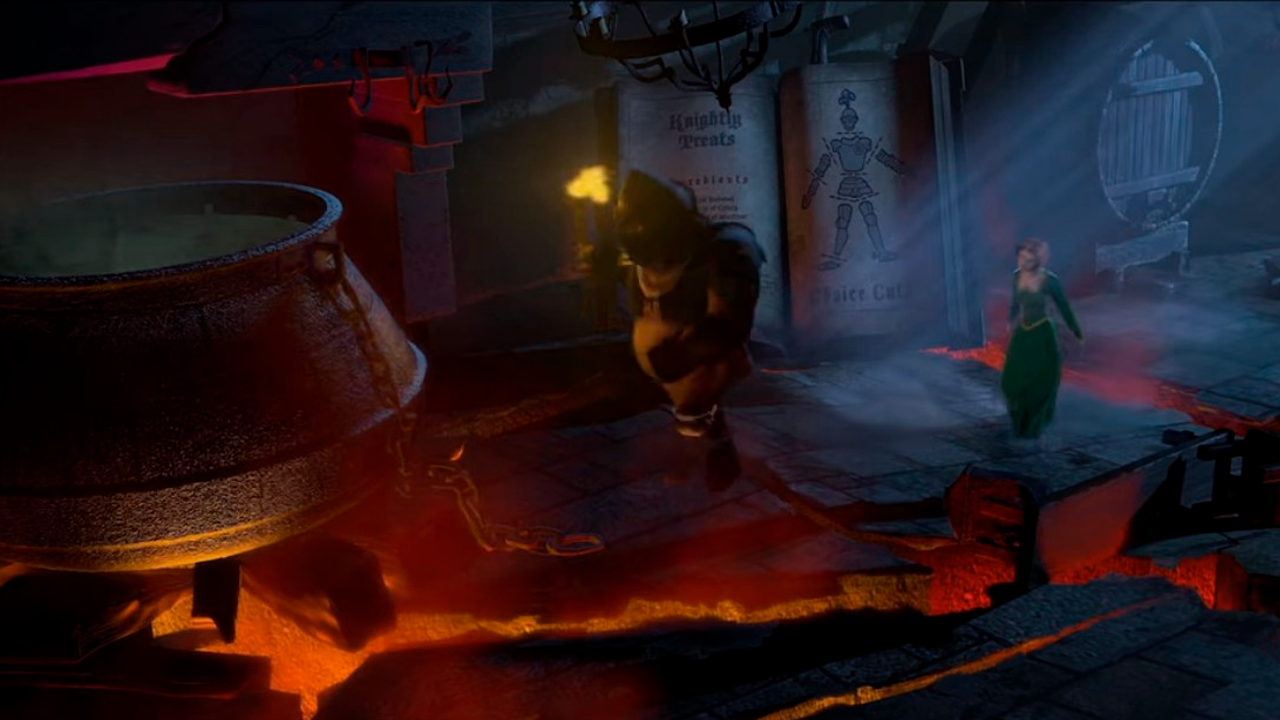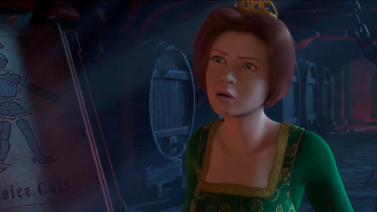 Es ahí cuando ella se detiene en seco y le exige a Shrek explicaciones sobre su identidad, quiere conocer el nombre y rostro del hombre para ofrecerle un pañuelo como muestra de su gratitud, aunque no está convencida de los métodos poco ortodoxos de rescate de este príncipe azul. Mientras esto ocurre podemos ver junto a ellos dos detalles que llaman la atención: un gran caldero con algo hirviendo y un enorme libro de recetas.