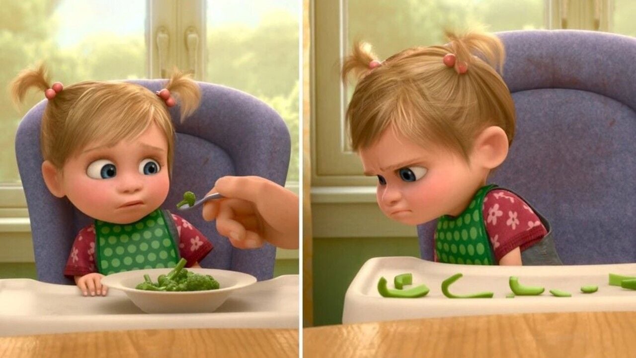 En la primera entrega de Intensamente, durante los momentos en los que vemos a una Riley bebé siendo alimentada en la boca por su papá podemos notar que la pequeña niña rechaza unos trozos de brócoli, llegando Desagrado “al rescate” justo en el momento adecuado.