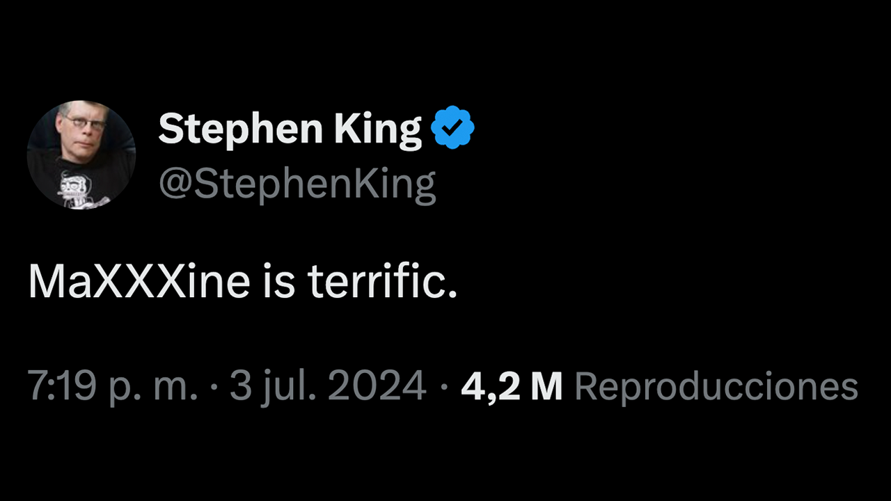 A través de una publicación en su cuenta de X, el popular autor de novelas dio a conocer su sentir sobre la película slasher. "MaXXXine es genial", fue la forma en cómo el novelista describió la tercera entrega de la franquicia de terror, invitando prácticamente al mundo entero a que vaya a los cines a disfrutar de ella. Con el sello de garantía de Stephen King, sin duda alguna, MaXXXine es más de lo que cualquier fanático del género podría pedir.