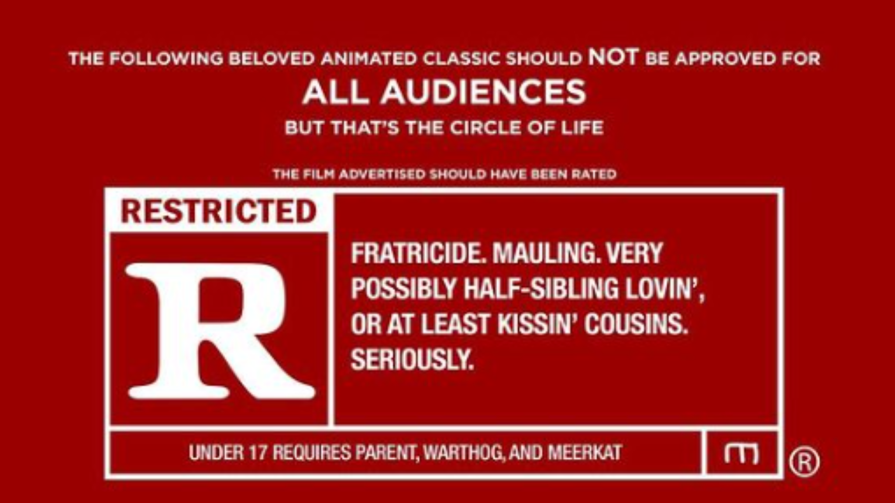 En cuanto a El rey león, cuya oscura teoría sobre el canibalismo fue aceptada por Disney recientemente, debería ser clasificada como R por “fratricidio, mutilación, muy posiblemente amor entre medio hermanos, o al menos besos entre primos”. Y Bambi debería obtener una R, escribió Reynolds, “porque la terapia no es barata” y el “asesinato a sangre fría de una inocente mamá ciervo causará un trauma de por vida”.