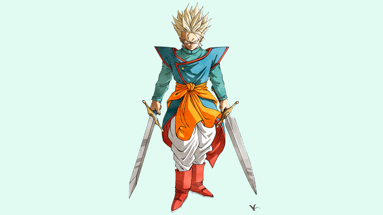 Además de usar el traje característico, aunque en color verde y no púrpura como el de Gohan, la imagen también muestra a Trunks portando dos Espadas Z, lo que podría indicar que no sólo logró extraerlas con éxito, sino que el saiyajin más especial de todos aprendió a utilizarlas tal vez para vengar la muerte de su amigo a manos de los androides malvados del futuro.