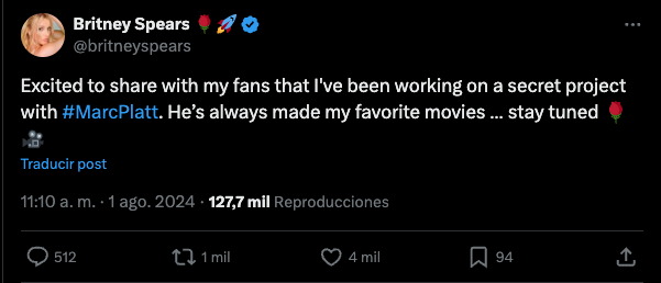 “Estoy emocionada de compartir con mis fans que he estado trabajando en un proyecto secreto con #MarcPlatt. Siempre ha hecho mis películas favoritas… estén atentos”, compartió Britney Spears a través de un mensaje en X.