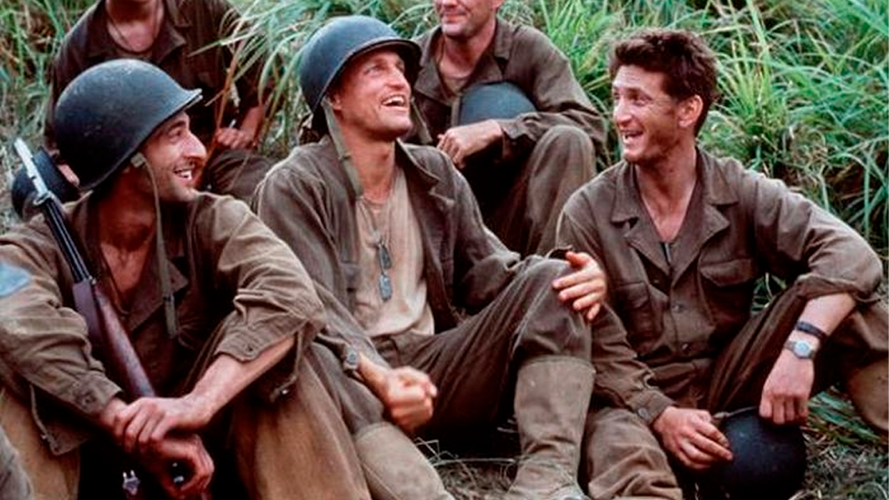 Al igual que con la última producción de Nolan, esta película bélica cuenta con un elenco tan reconocible como Sean Penn, Nick Nolte, Adrien Brody, George Clooney, John Cusack, Woody Harrelson e inlcuso un joven Jared Leto, por mencionar algunos. Sin embargo, la fama de cada uno de ellos no es problema para centrarse en lo que la película de Malick busca transmitir.