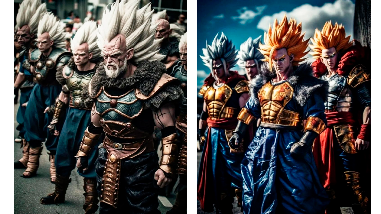 En la primera imagen, a juzgar por las cicatrices en el rostro, podríamos pensar que se trata del Rey Vegeta y toda su legión de guerreros incluido el Príncipe de los Saiyajin en alguna de sus transformaciones (aunque no la quinta, porque esa es obra de otro artista en Instagram).