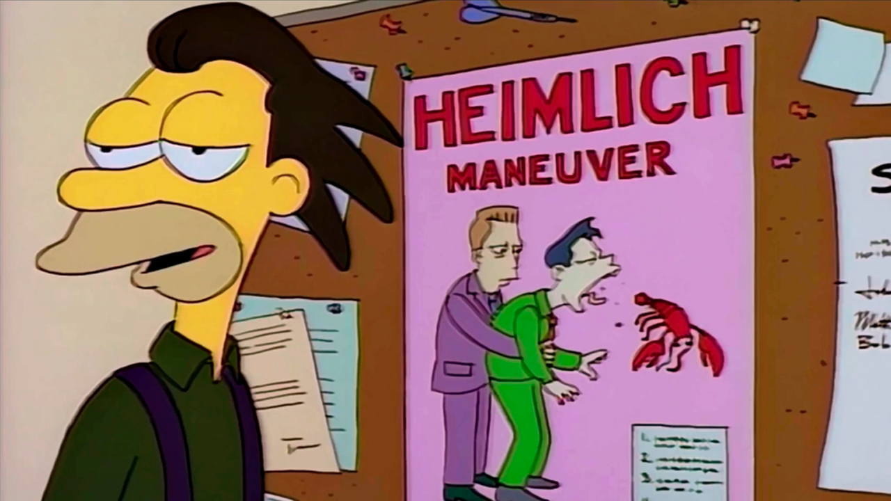 Lenny y el resto de sus compañeros de trabajo parecen acostumbrados a esto pues incluso Karl aparece en escena diciendo: "Ya se está ahogando otra vez". Entonces con total indiferencia Lenny se gira hacia el tablero de anuncios donde se observa un póster que ejemplifica la maniobra de Heimlich, para salvar a alguien en casos como este, aunque la atención de él y todos los demás se centra en la convocatoria para formar un equipo de béisbol, lo que aborda el resto del capítulo.