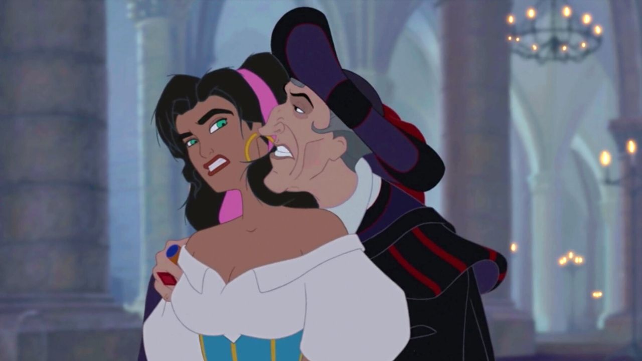 Además de su deseo de genocidio, la lujuria de Frollo lo convierte en un villano aún más siniestro. Su obsesión por Esmeralda, la gitana a la que inicialmente ve como una amenaza, pronto se transforma en un deseo incontrolable. En la icónica canción “Hellfire”, Frollo expresa su conflicto interno entre su atracción hacia ella y su convicción de que dicha atracción es un pecado. Esta combinación de deseo sexual y odio lo lleva a un ultimátum macabro: Esmeralda debe someterse a él o enfrentarse a la hoguera. La escena es un ejemplo brutal de cómo la corrupción moral y el poder pueden distorsionar el deseo en algo monstruoso.
