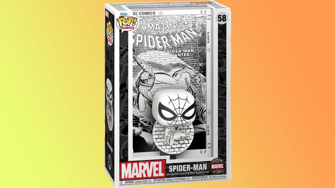 Este Funko Pop! de Spider-Man se distingue por su cuidado en los detalles, su aspecto es en blanco y negro posando en una pared. También, en el fondo se aprecia el cómic del superhéroe Spider-Man Wanted de Amazing.