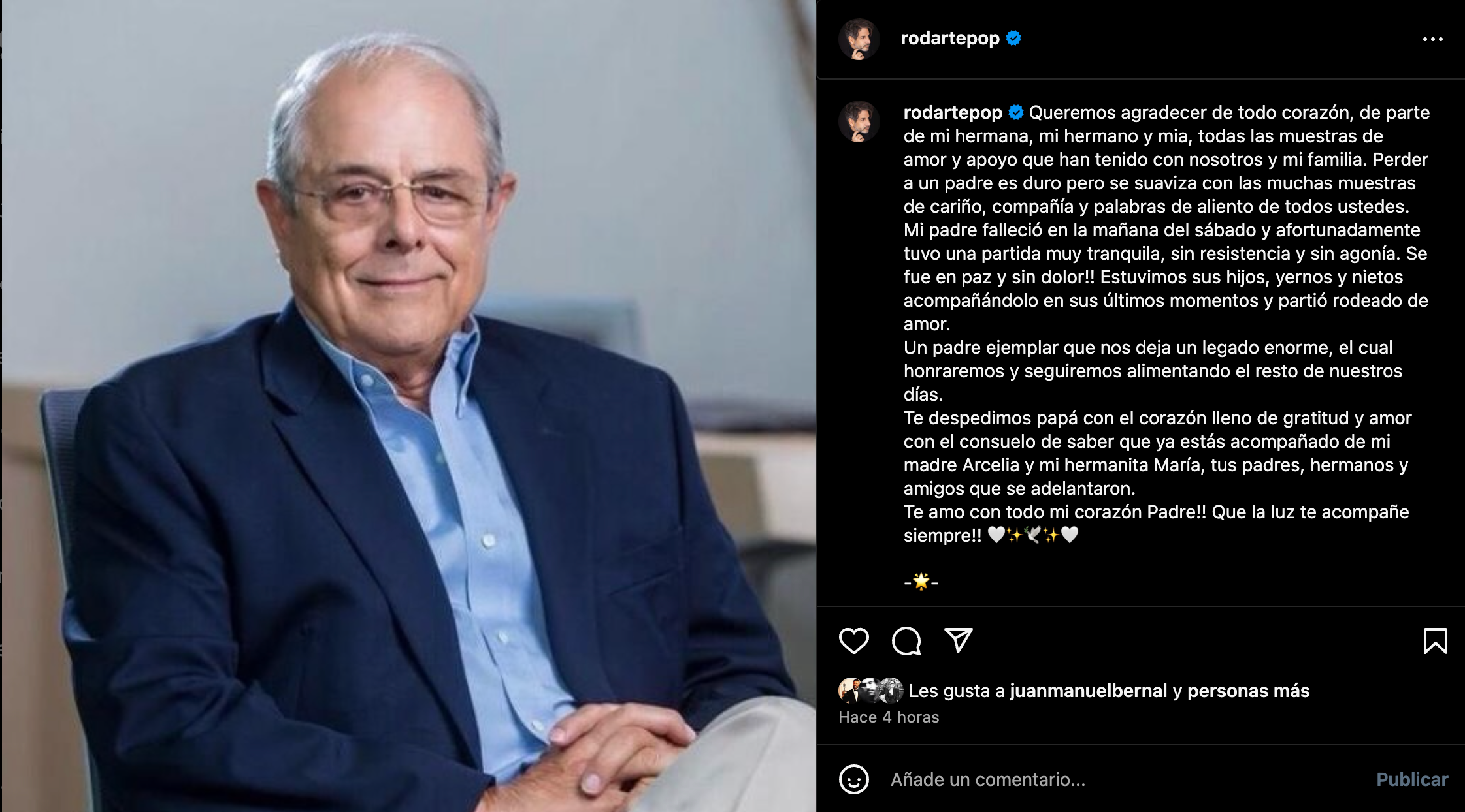 Fue mediante una publicación en Instagram donde Rodarte compartió un emotivo mensaje de despedida. “Queremos agradecer de todo corazón, de parte de mi hermana, mi hermano y mía, todas las muestras de amor y apoyo que han tenido con nosotros y mi familia. Perder a un padre es duro pero se suaviza con las muchas muestras de cariño, compañía y palabras de aliento de todos ustedes. Mi padre falleció en la mañana del sábado y afortunadamente tuvo una partida muy tranquila, sin resistencia y sin agonía”.