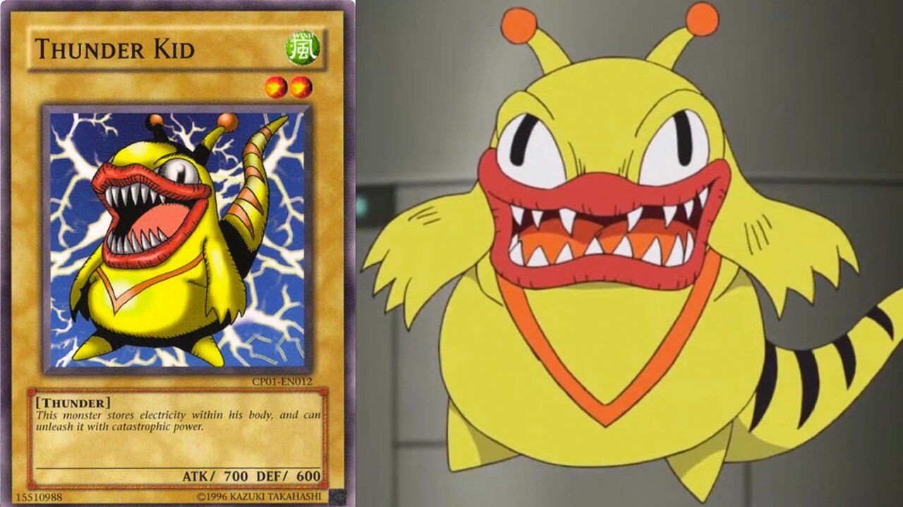 En la temporada "Monstruos Encapsulados", de Yu-Gi-Oh!, Yugi y sus amigos son transportados a un mundo de juego mágico donde pueden hacerse amigos de las criaturas y atraparlas, algo sospechosamente parecido al de los monstruos de bolsillo de Pokémon. Tristan logra capturar a un monstruo grotesco llamado "Thunder Kid", una criatura con rayas amarillas que puede usar ataques eléctricos. De manera evidente, sobra decir que esto es una parodia de nuestro querido Pikachu.