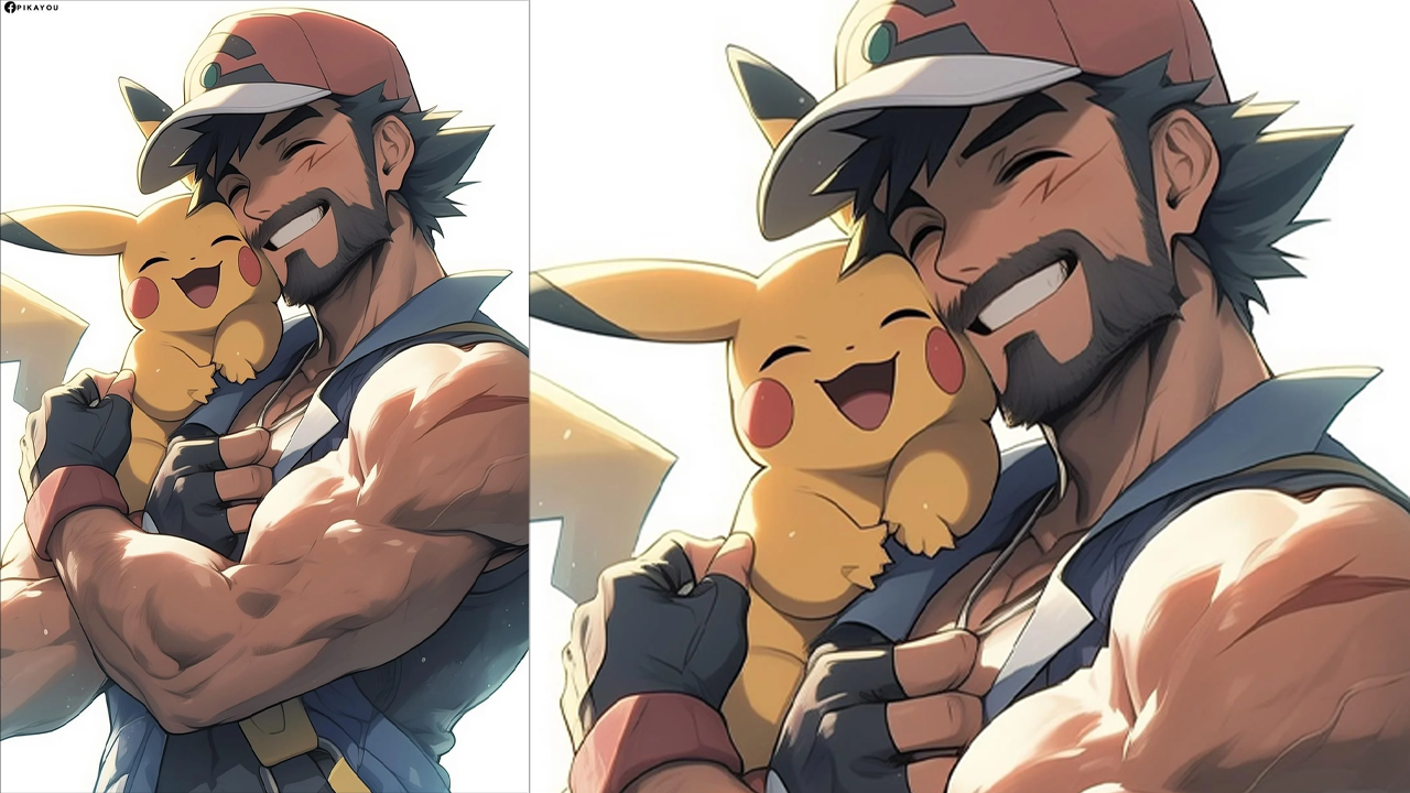 Aunque Ash ya tenía el cabello en forma de pico al igual que Goku y Vegeta, ahora el entrenador habría logrado el mismo físico que un poderoso Saiyajin. Con unos brazos bastante trabajados, Ash aparece abrazando a su fiel compañero, el ratón eléctrico. Ahora, lo único que faltaría sería ver a Goku transformado en todo un Super Saiyajin Fase 1 o Fase 2, donde su melena se tornaría de color rubio, acumulando tanta energía y poder como si fuera un Pikachu haciendo un "Impactrueno".