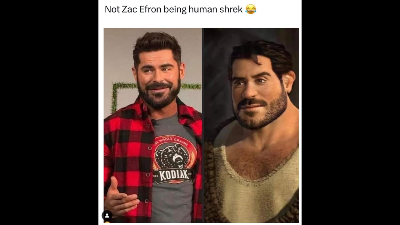 Para probar que el actor de Garra de hierro está hecho para este momento y no hay nadie más adecuado que él, se compartió una imagen en la que se compara a Shrek humano con Zac Efron, y la realidad es que sí son muy parecidos. Con una barba densa, un peinado fresco y una mirada que irradia seguridad, Zac Efron podría ser el representante perfecto de este momento en la vida de Shrek.