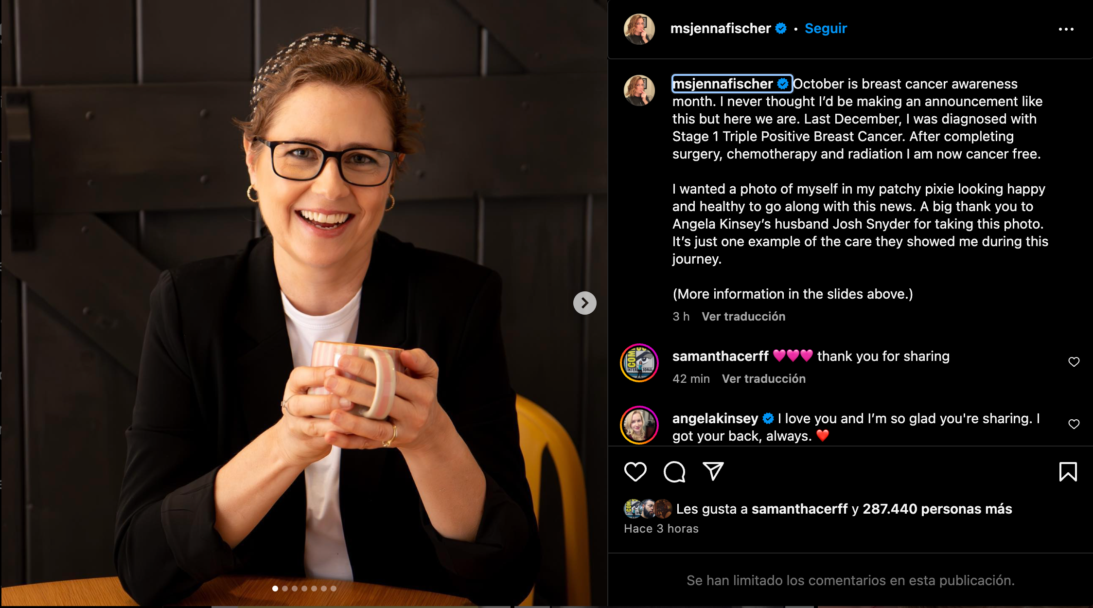 A través de Instagram Jenna Fisher compartió un mensaje que no sólo sorprendió a sus fans, también lo hizo para crear conciencia sobre este padecimiento, pues octubre es el mes para concientización del cáncer de mama, algo que fue acompañado de una carta dedicada a todas las mujeres que están pasando por algo similar.