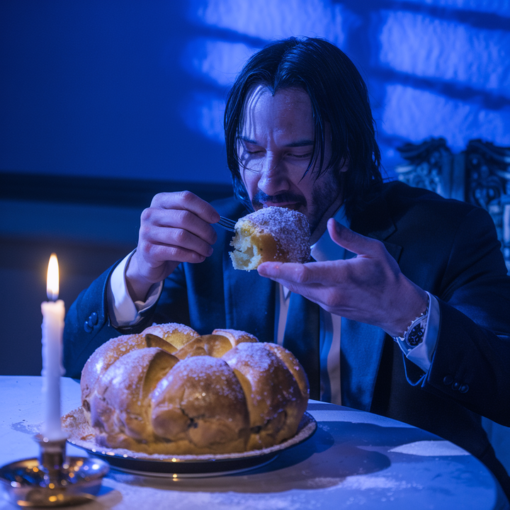 Por lo tanto, como el pan de muerto ya es un manjar que se disfruta en todo el mundo, su dulzura y esponjosidad lo convierten en una delicia perfecta para acompañar un café o un chocolate caliente, y hasta en el cine ya que gracias a una Inteligencia Artificial podemos ver a personajes como John Wick (Keanu Reeves) disfrutándolo.