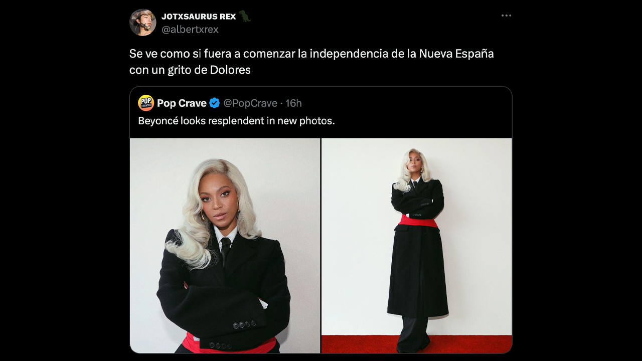 "Se ve como si fuera a comenzar la independencia de la Nueva España con un grito de Dolores", fueron las cómicas palabras del internauta con el alias "albertxrex", quien hizo reír a todo X al comparar a la cantante con el mismísimo Miguel Hidalgo y Costilla. En la imagen se puede ver a Beyoncé usando un traje negro holgado, una camisa blanca y una tela roja atada a la cintura, además de llevar el cabello de color platinado. El nuevo look de Beyoncé le hizo ser relacionada con el Padre de la Patria, una de las figuras más importantes de la historia de México.