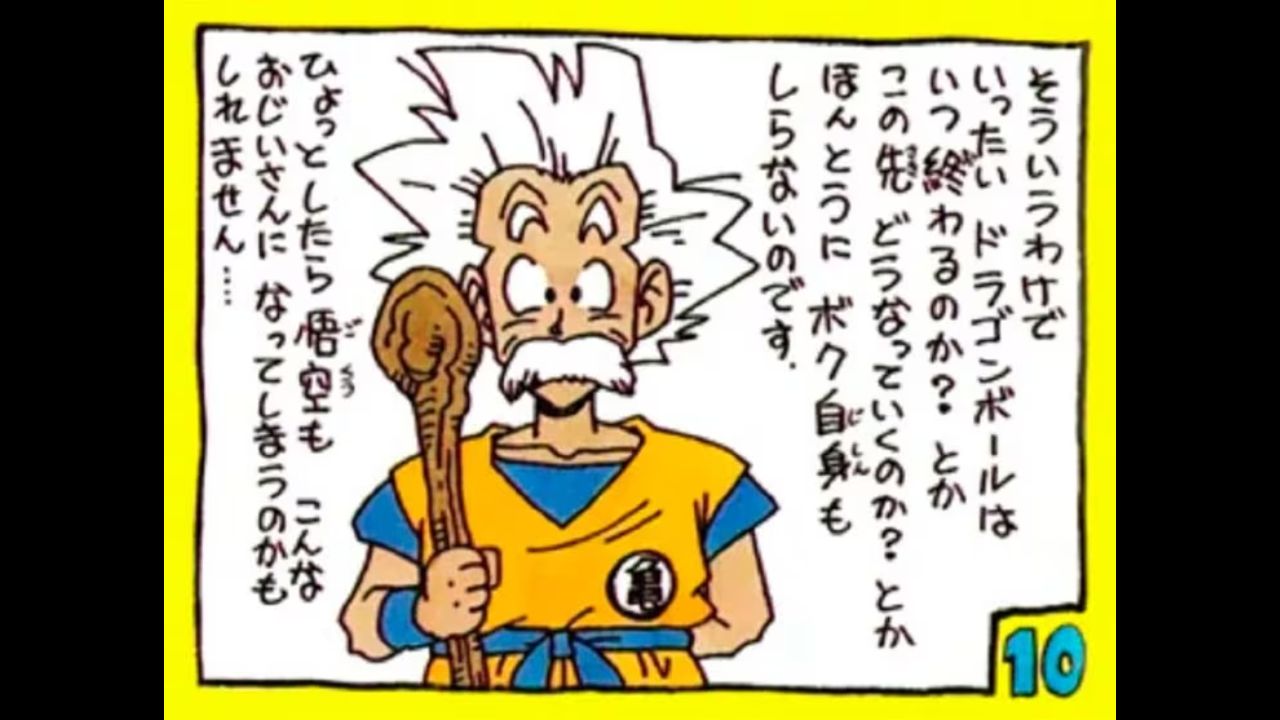 Con una divertida e inédita ilustración de un Goku anciano, Toriyama disipó dudas acerca de cómo sería el Saiyajin en una edad avanzada. Con el cabello blanco, vello facial y un bastón para apoyarse, la imagen de Goku anciano podría ser confundido con el polémico Maestro Roshi y el abuelo Gohan. Esta imagen fue hecha en 1989 durante el arco de Freezer para el número especial "Dragon Ball Z Anime Special".