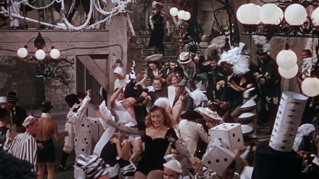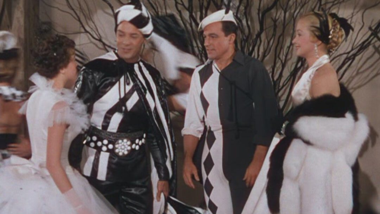 La fiesta, celebrada en un salón lleno de estudiantes de arte vestidos con opulentos disfraces en blanco y negro, representa el exceso y la exuberancia de la época. Los detalles en los trajes y la escenografía transportan al espectador a un mundo de fantasía y lujo. En medio de todo ese caos festivo, Gene Kelly destaca con su atuendo de arlequín, interpretando con maestría a un hombre atrapado entre el júbilo externo y su melancolía interna por el amor no correspondido.