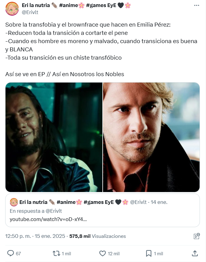 El usuario de X argumentó que no entendía por qué Audiard no contrató a una persona morena para filmar las escenas de ‘Manitas’ o por qué no mostrar la piel del personaje tal como es la de Karla Sofía Gascón, pues la decisión final mostró a la actriz española haciendo brownface frente a las cámaras. “¿Por qué no ponerla directamente como actúa en Nosotros los Nobles?”, comentó al hacer comparaciones entre ambas películas.