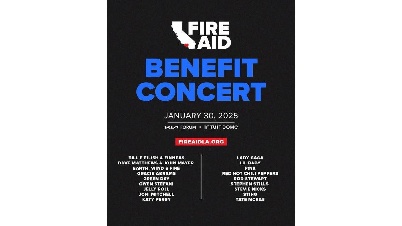 El concierto benéfico lleva por nombre FireAid y fue organizado por el empresario estadounidense Irving Azoff, quien presentó la iniciativa para ayudar a las víctimas. Entre los artistas que se presentarán en el espectáculo se encuentran las ganadoras del Oscar Billie Eilish y Lady Gaga, además de las bandas de rock Green Day y Red Hot Chili Pepers, así como las cantantes juveniles Olivia Rodrigo y Gracie Abrams.